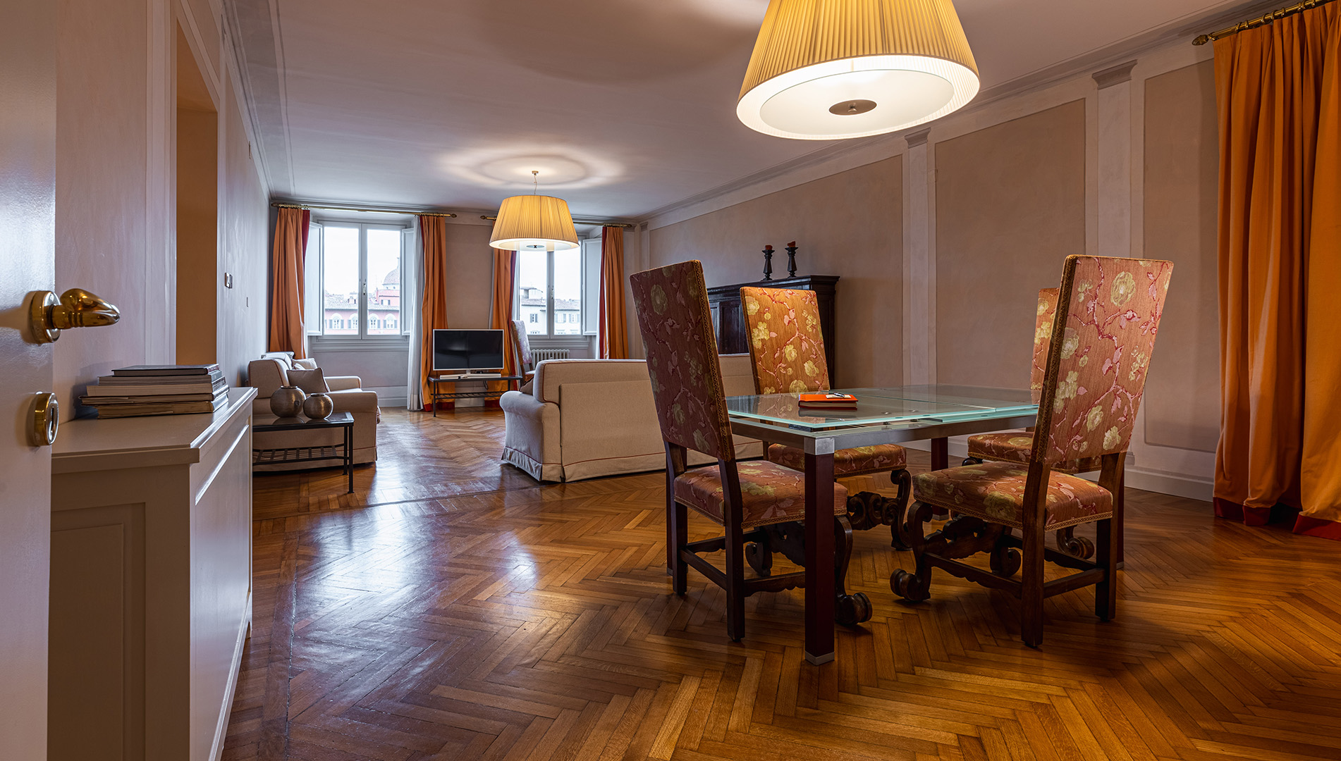 This beautiful apartment is on the third floor of Palazzo Gianfigliazzi and, with its 100 - 200 square meters, offers antique furniture wisely enriched with design objects of contemporary flavor. It can be rented with one to three bedrooms. Two of the bedrooms can have queen or 2 single beds.The bathrooms have showers only. The apartment can host up to seven people and is equipped with Wi-Fi, satellite plasma TV, DVD player and free video library for guests, direct dial telephone, minibar, safe, air conditioning and heating, hairdryer, slippers. The rate includes daily cleaning, Wi-Fi connection, VAT and all services (excluding breakfast).