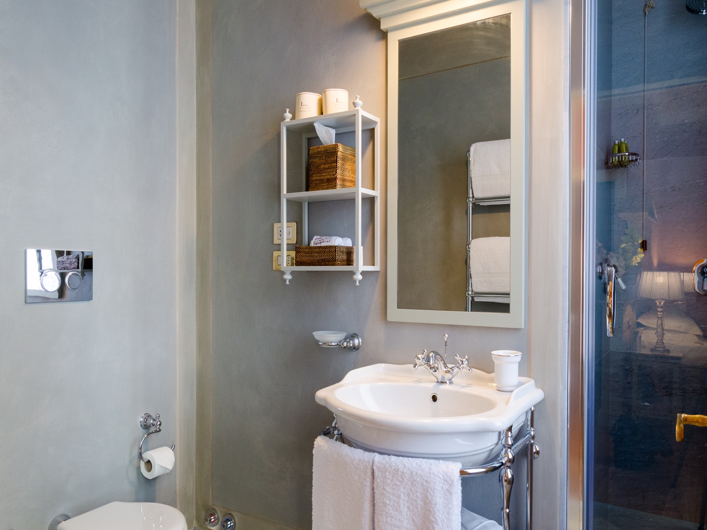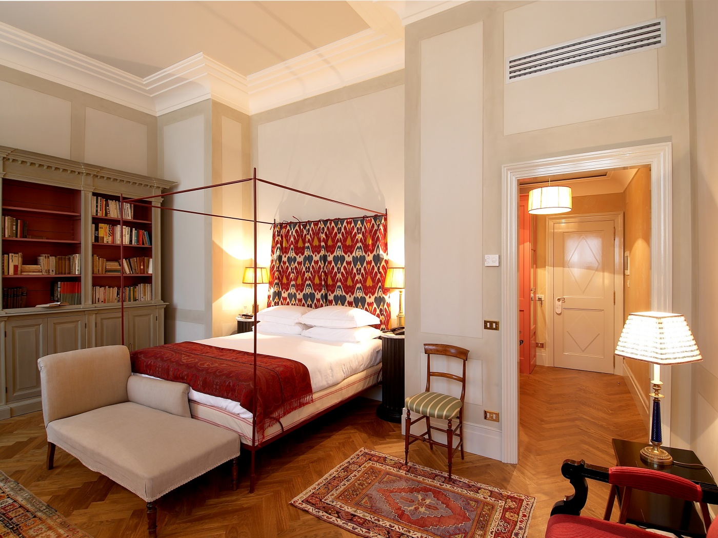 Our Library Rooms are furnished with wall-to-wall libraries with period volumes and literature on Florence. They offer views of via de’ Tornabuoni or the Arno. The rooms offer spacious bathrooms in red Alcantara or white marble with bathtub and “rain” shower. The windows offer views of Piazza Santa Trinita and Palazzo Feroni Spini or the Arno. The room size is 35 square metres, with king-size bed, light oak parquet, wardrobe, high-resolution LCD TV, DVD player, telephone with direct-dial external access, mini-bar, electronic safe. All of the rooms offer heat and air conditioning, complimentary WiFi access, shoe horn, slippers, and hairdryer.The room can be connected to the Hammam Jr. Suite.