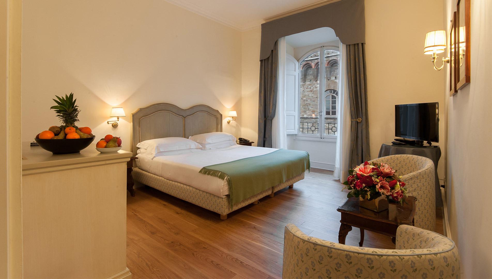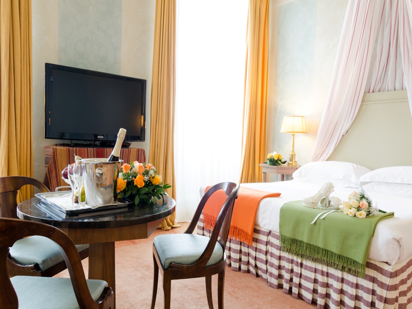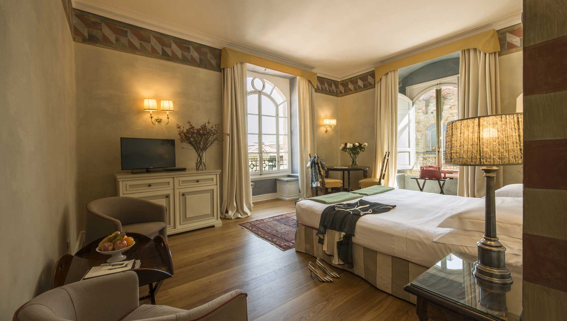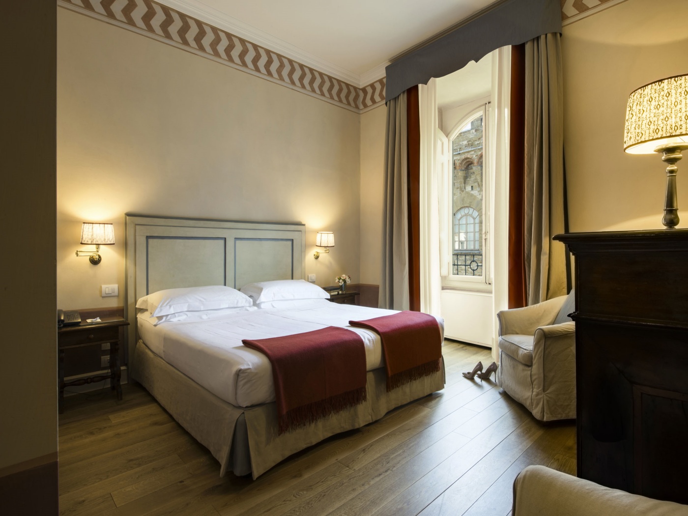 These double rooms are located in the Medieval Tower or in Palazzo Gianfigliazzi and most of them offer incomparable views of the Cathedral, the Church of Santa Trinita, the Arno, or the hills surrounding Florence. The room size is 20 square metres. Rooms are available either with king-size bed or twin beds and offer marble bathroom with bathtub or box shower, finely appointed wardrobe, parquet floors, large-screen LCD television, DVD player, telephone with direct-dial external access, mini-bar, electronic safe. All of the rooms offer heat and air conditioning, complimentary WiFi access, shoe horn, slippers, and hairdryer. A Deluxe room can be connected to the Romantic Jr. Suite; another Deluxe room can be connected to the Renaissance Suite. This will facilitate the stay of families and groups with large numbers of people.