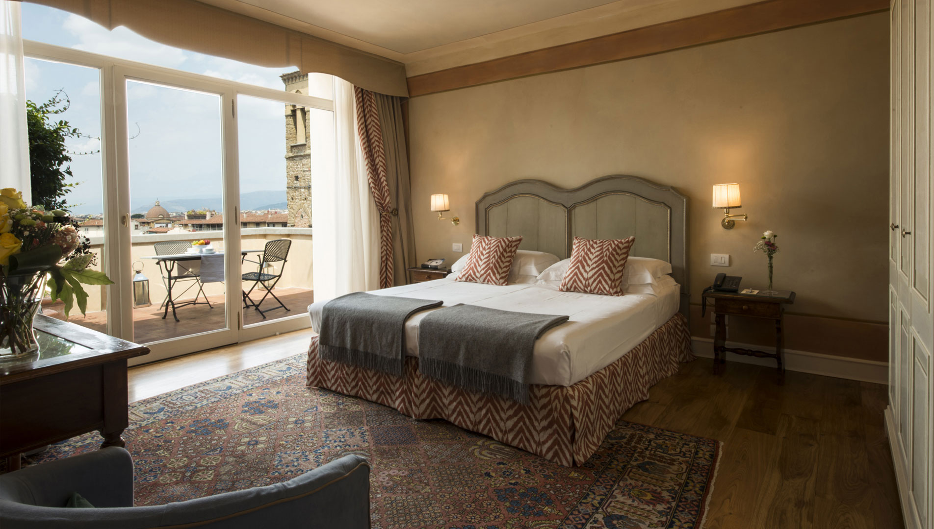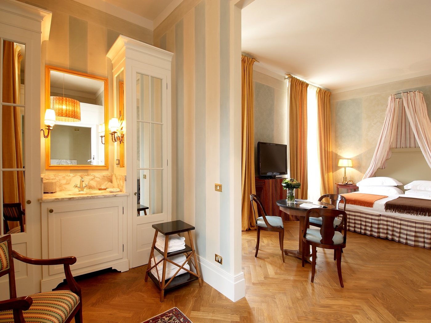 The exclusive jasmine-perfumed private terraces and sweeping views of Monte Morello and the Appenines characterize these splendid rooms in the Medieval Tower. These extremely bright and quiet rooms range in size from 20 to 25 square metres. Rooms are available either with king-size bed or twin beds and offer marble bathroom with bathtub, finely appointed wardrobe, parquet floor, large-screen LCD television, DVD player, telephone with direct-dial external access, mini-bar, electronic safe. All of the rooms offer heat and air conditioning, complimentary WiFi access, shoe horn, slippers, and hairdryer. A Grand Deluxe room can be connected to three Classic rooms to facilitate the stay of families and groups with more people.
