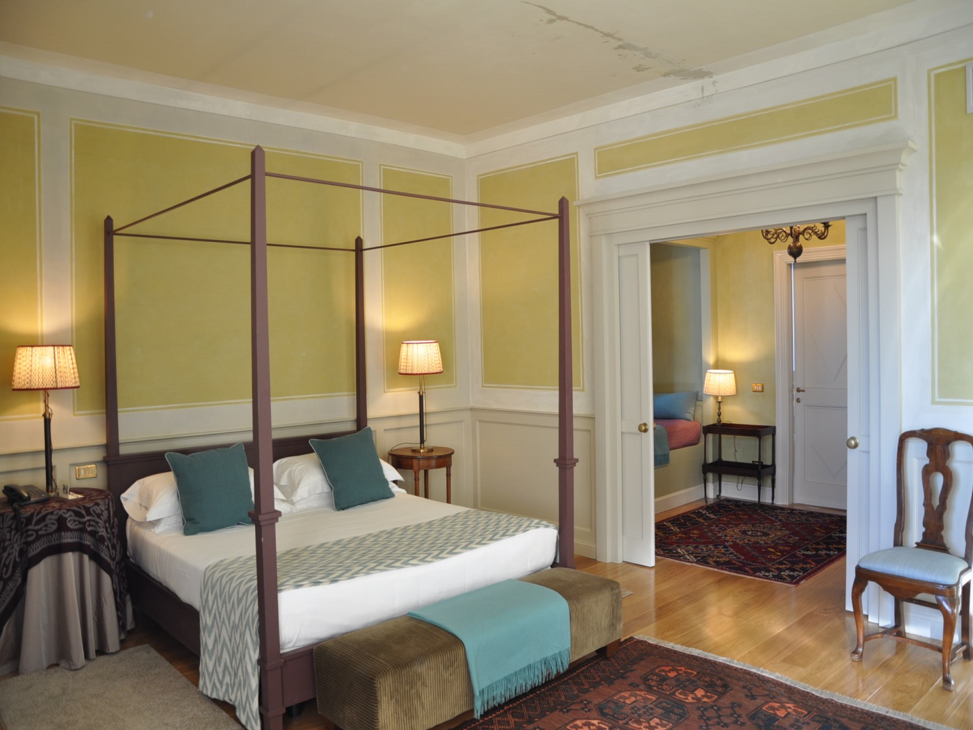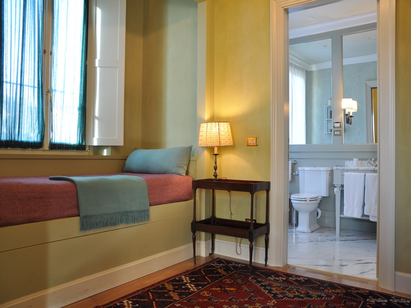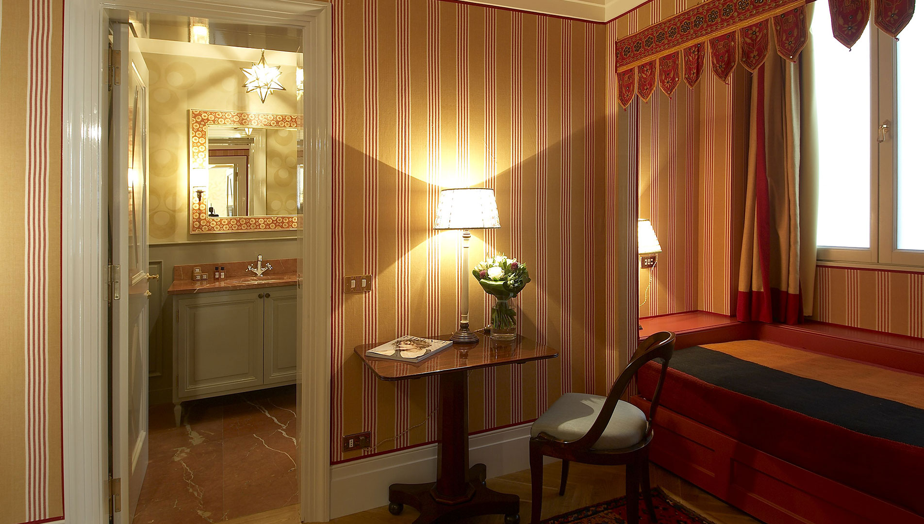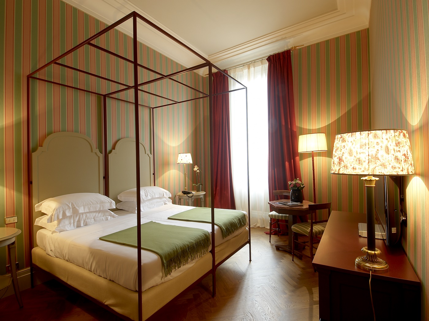 This spacious Suite with renaissance flair measures 50 square meters and overlooks Via de Tornabuoni and has views of the Arno River. The walls are decorated with warm shades of red and gold or green and turquoise, with strong reference to the colors used by Giotto in altarpieces. The entrance, adorned with curtains in rich fabrics, has a single bed placed in an alcove. The wide and bright bedroom is available with double or twin beds and offers finely hand-painted walls. The two bathrooms available in each of the two suites are in red Alcantara or white Carrara marble, one of which is finely decorated with a Cintamani motif of Ottoman tradition. The bathrooms, one of which is also designed for disabled people, include two large sinks, a bathtub and a shower. The room can be connected with a Deluxe room to facilitate residence for families and groups with large numbers of people.