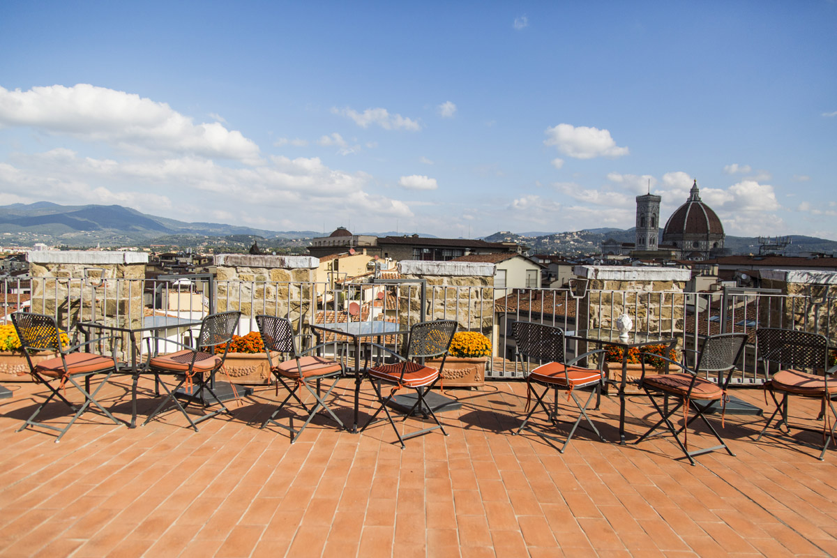 Only our guests can access the terraces and enjoy an unique view of Florence. The dome of Santa Maria del Fiore, the hills of Fiesole and Settignano, the Arno River, the Santa Trinita Bridge and Via Maggio, the church of San Miniato a Monte, Forte Belvedere designed by Buontalenti, the hill of Bellosguardo, Palazzo Vecchio, the bell tower of Santa Trinita: wherever you turn, Florence will show you all its splendor.