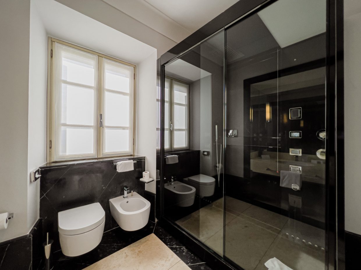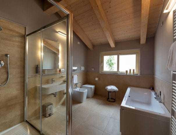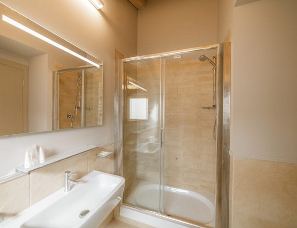 Furnished in a modern style with parquet and exposed wooden beams. They have a corner with an armchair and a desk and a small terrace with a high wall overlooking the valley and the village. The travertine bathrooms enjoy natural light and are equipped with comfortable showers. King size beds (180x200), located on the third and top floor, 18sqm.