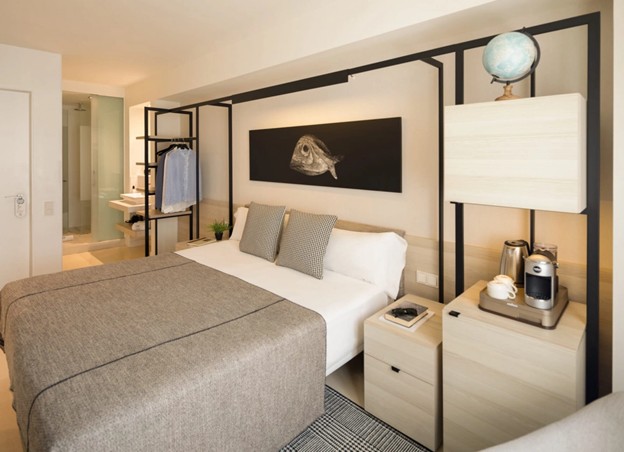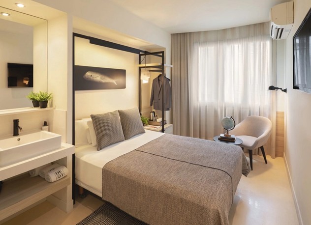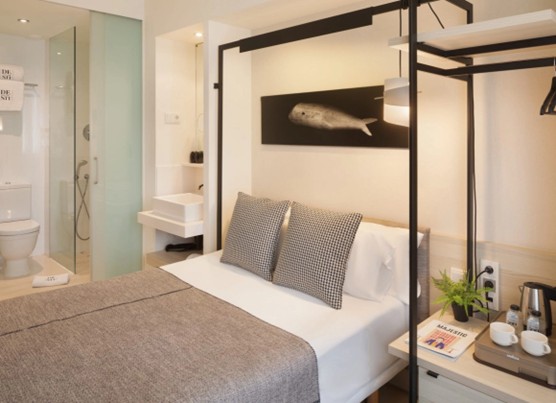 Each corner of the Hotel Denit has been designed to offer an aesthetic and comfortable experience. The rooms achieve a perfect balance between minimalism and functionality, featuring designer furniture from brands like Hay, Andreu World, and Pedrali, and carefully selected lighting from Jieldé, Vibia, and Faro.