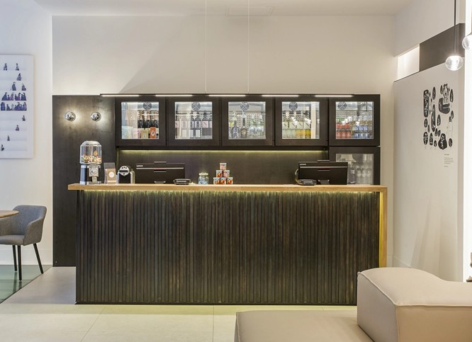 A casual and versatile space, where you choose its function. The spacious lobby has tables surrounded by comfortable armchairs and a large sofa that make up the Snack & Drinks space, where the reception staff serves drinks and snacks 24 hours a day, permitting guests to reward themselves after an intense day of work or tourism in the city.A casual and versatile space, where you choose its function; thought of as the meeting place where everything starts and where to end the day, sharing experiences or disconnecting from the bustle of the city.