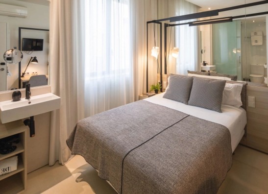 A larger space and with style. Their well-used 17,6 sqm / 189 sf can accommodate a 190x180 double bed or two single 190x90 beds for up to two people, for those who prefer space and comfort when it's time to rest. The Design rooms adhere to that charming and casual line of minimalist, functional, and elegant décor. The reading armchair invites the guest to disconnect and relax after an intense day spent visiting the city.