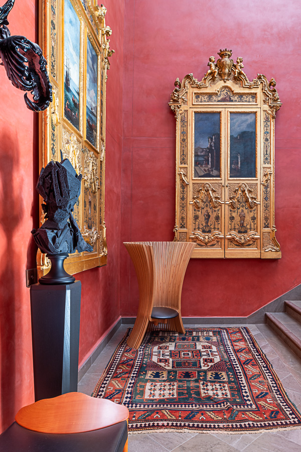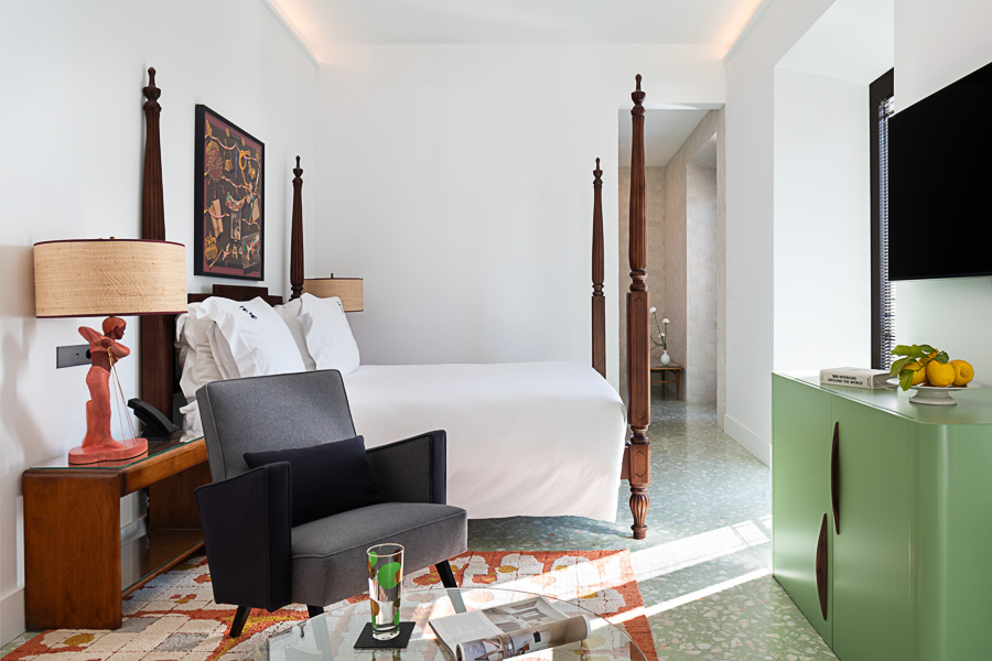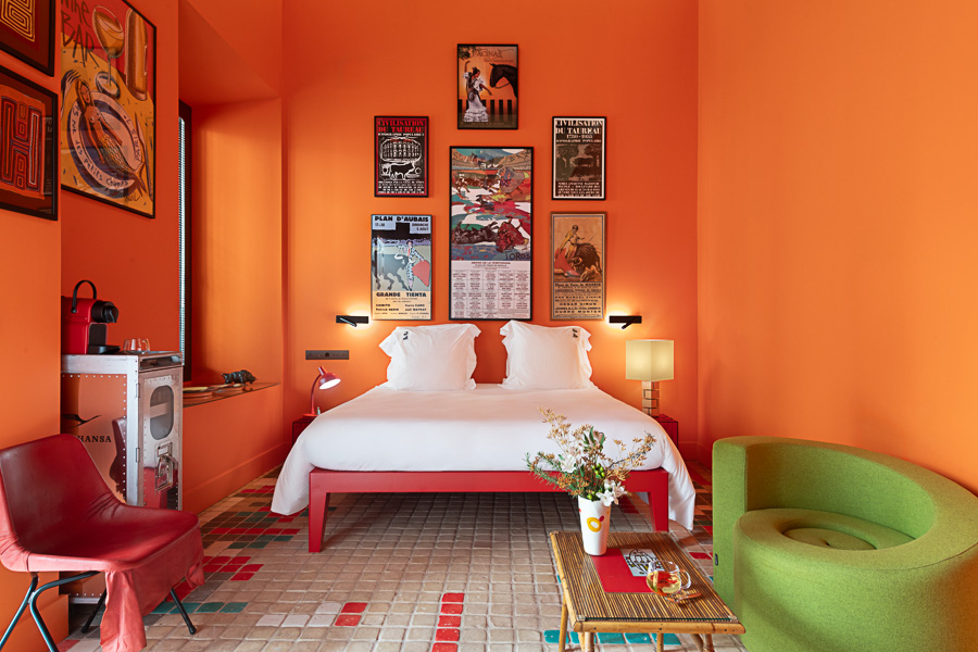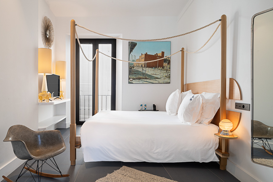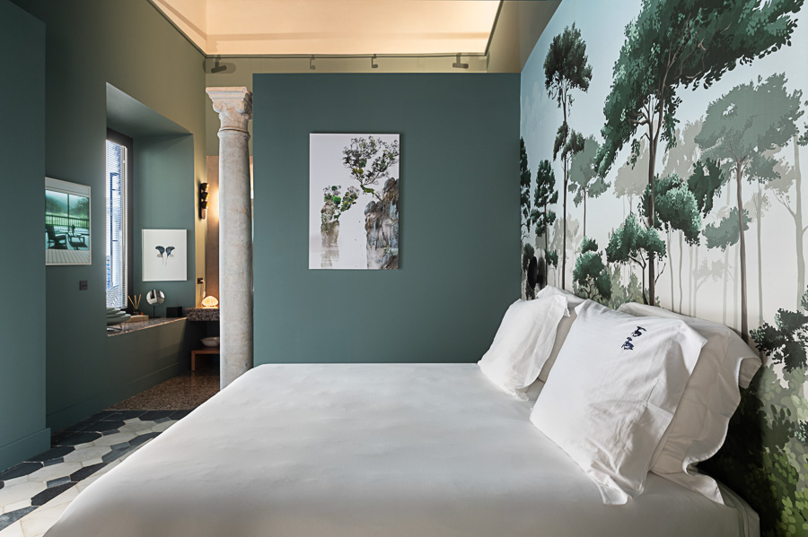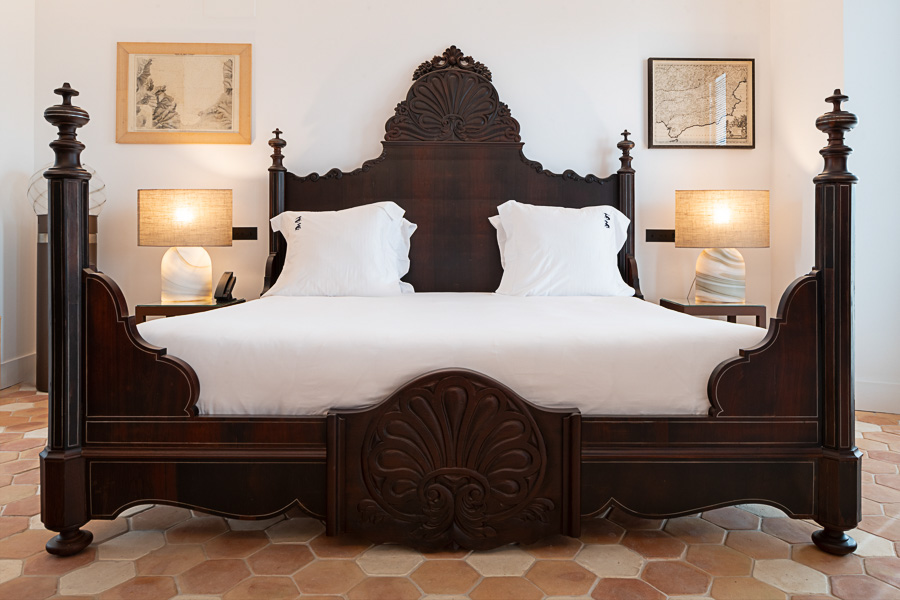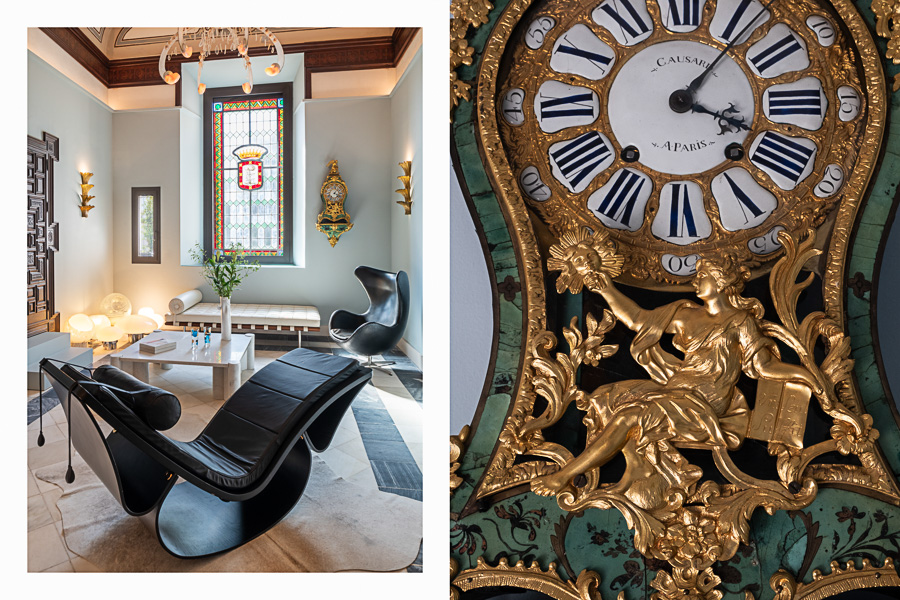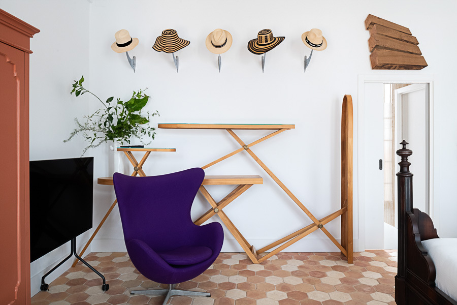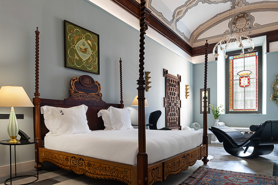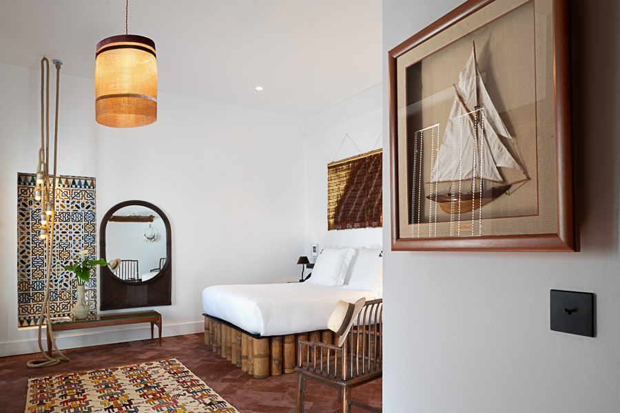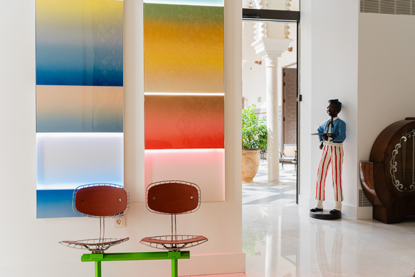 A hotel with a pool in Seville? Yes! By reducing the original pool by half and respecting the water scarcity. The color scheme of our hotel: so many railings, so many lampposts to restore and paint… why always black? In the color palette, RAL 5004 is a beautiful midnight blue that you will find in the marble plaque on the facade, in the iron elements, in the original ceiling lamps, even in the kimonos (yucatas) in your room!
