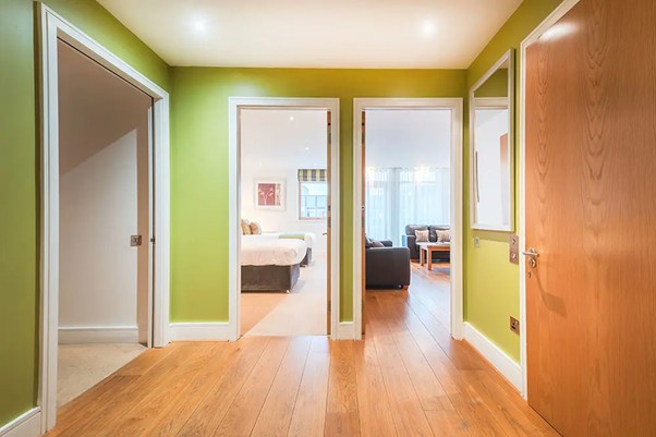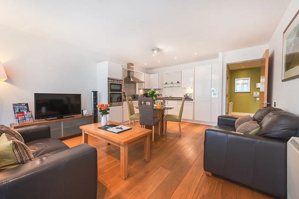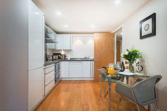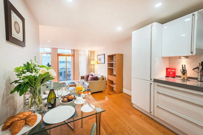 Offering comfort, space, and all the essentials, our Limited View Two Bedroom serviced apartments are an excellent choice for those travelling together. These stylish apartments are set on the quieter side of the building and include a small balcony, accessed via full-length French doors. The master bedroom features a king-size bed and en-suite bathroom. The second bedroom offers twin beds (can be converted into a super-king on request), and there’s a light-filled open-plan living and dining area. A modern kitchen includes high-spec appliances like a double oven, ceramic hob, and dishwasher, while a separate utility room provides a washing machine and drying facilities.